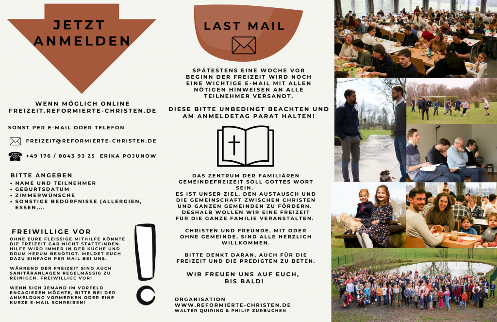 Der Kontakt von Gemeinden und Christen untereinander - zur Stärkung, Ermutigung und zum Austausch - ist sehr wichtig. Dazu gibt es für Gemeinden aus der Schweiz, Frankreich, Deutschland, England - oder woher du auch kommen magst - diese Freizeit. Herzliche Einladung! Egal ob du jemanden kennst oder nicht, schon mal dabei warst oder es das erste Mal ist, ob du eine Gemeinde hast oder keine - wir freuen uns auf dich!